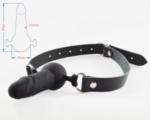 Силиконовый кляп в виде сферы и небольшого фаллоимитатора, прикреплен к ремешкам из натуральной кожи. Регулируется кляп при помощи металлической пряжки. Металлическая фурнитура имеет никелевое покрытие. Общая длина 59 см. Max диаметр шара 38 мм, длина кляпа 9,7 см. Ширина ремешков 20 мм